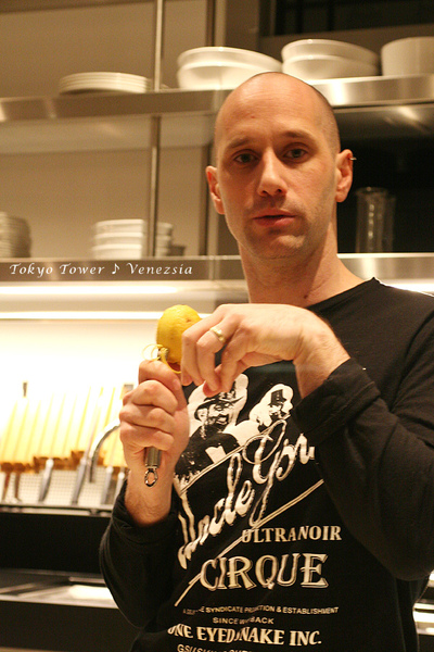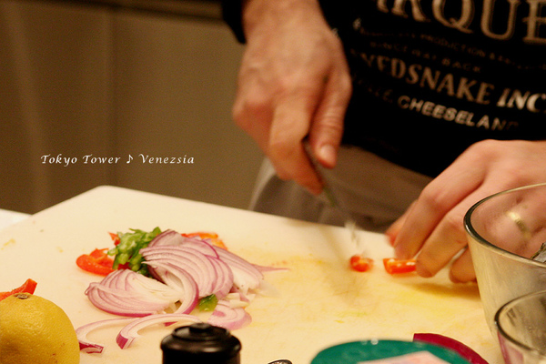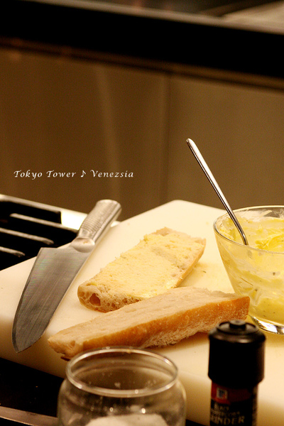 首先,Brian先示範烹煮BRUCHETTA,這是我們在外面餐廳常吃到的前菜,剛出爐的麵包,切成大小適中,方便入口的長方塊,表面塗著他特製香氣四溢的大蒜醬和蕃茄。