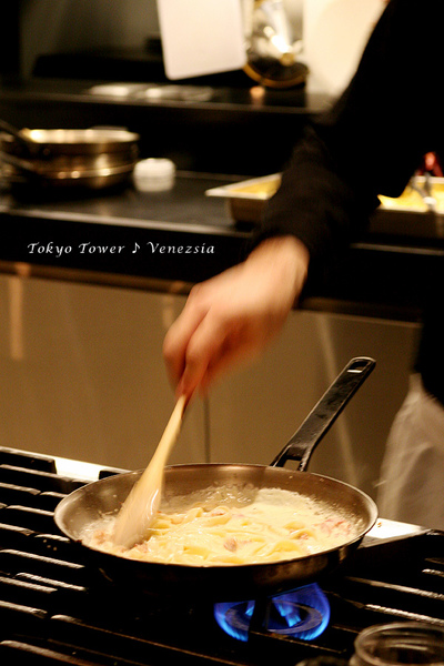 再來是Brian示範兩道義大利麵,【青醬鮮蝦筆管麵】與【培根蛋麵】。過程不算繁複,卻有著私房技巧喔!【青醬鮮蝦筆管麵】是一道由很多蔬食與海鮮構成的營養佳餚,基本蔬菜有青、紅椒、紅洋蔥、蕃茄、辣椒,加上新鮮的蝦仁(Brian小提醒:記得把蝦子的「髒東西」去除。)清炒的義大利麵,拌炒最後,加入cream→倒入煮好的義大利麵→加入青醬→灑上胡椒→收汁→加入檸檬皮。