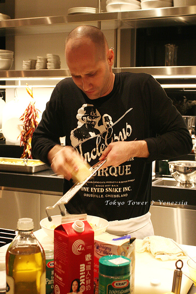 最後在一個小碗裡打一整顆蛋,並到cream到八分滿,均勻打散後,再最後加入鍋裡。起鍋前,加入剛刨好的乳酪條(Brian真是表情生動的老師:p)。