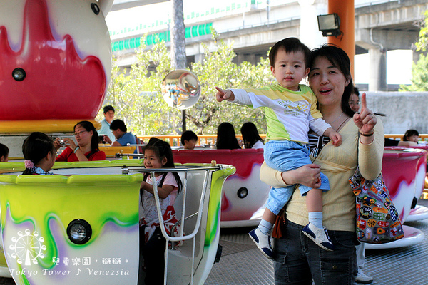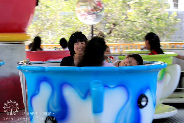 咖啡杯,我記得上一次來是高中時了,我們幾個同學還刻意安排比較「有份量」的人坐邊邊,旋轉時會很有離心力:p 這位媽媽帶著小孩與咖啡杯來張最後的留念。