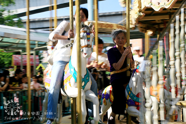 老奶奶也坐旋轉木馬 :-) 坐在旁邊的孫女要奶奶抓緊木桿,要出發囉!